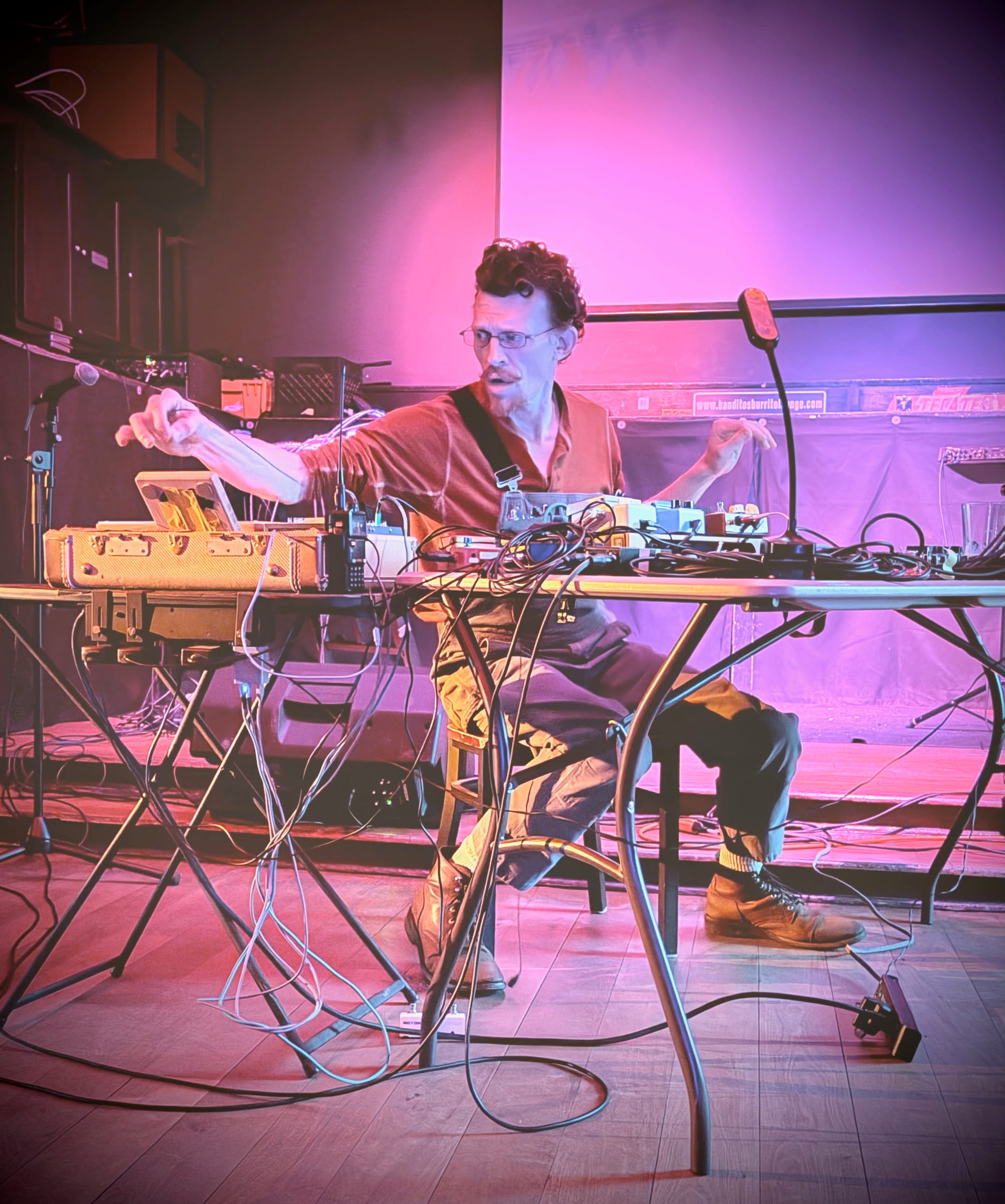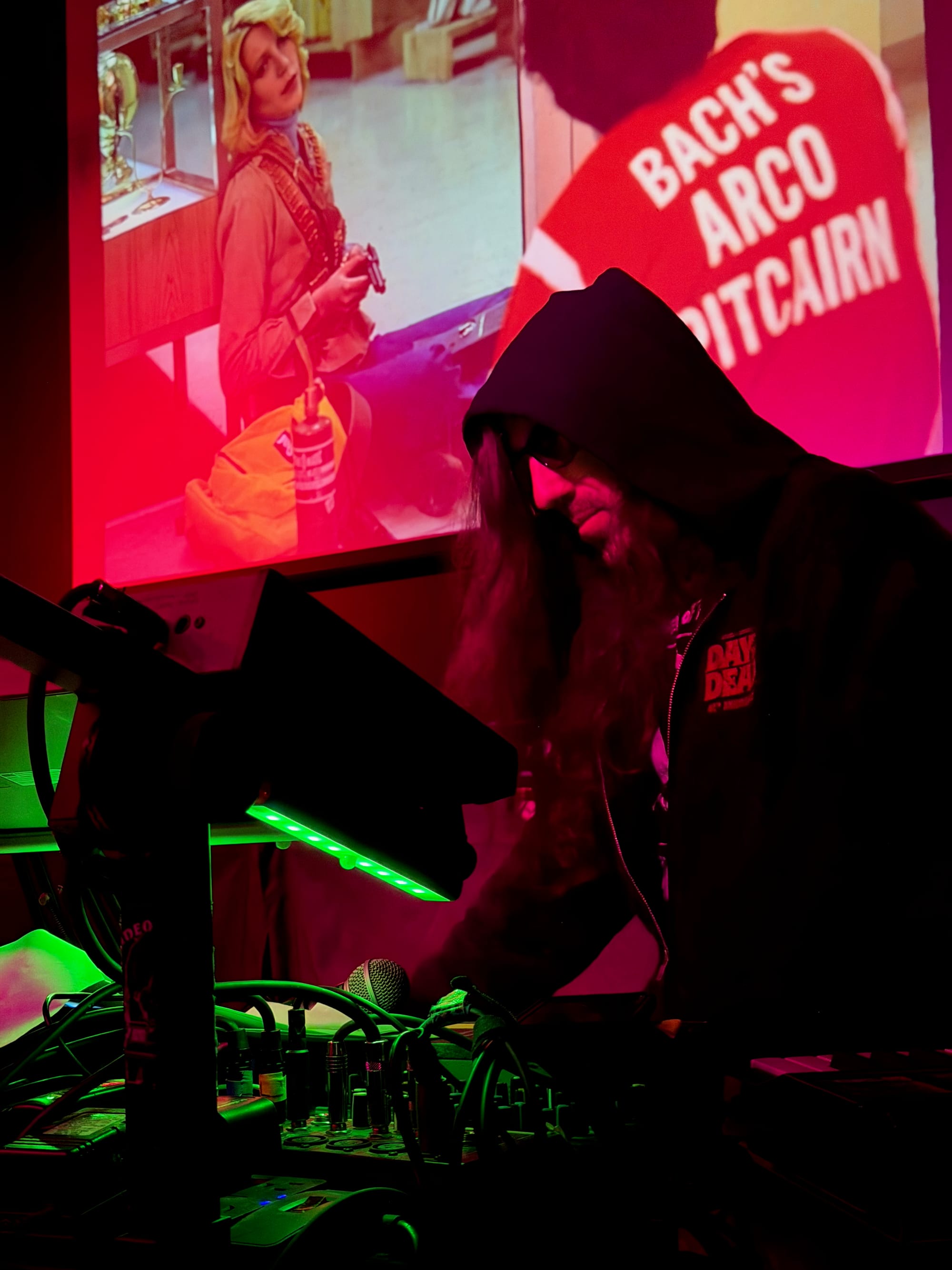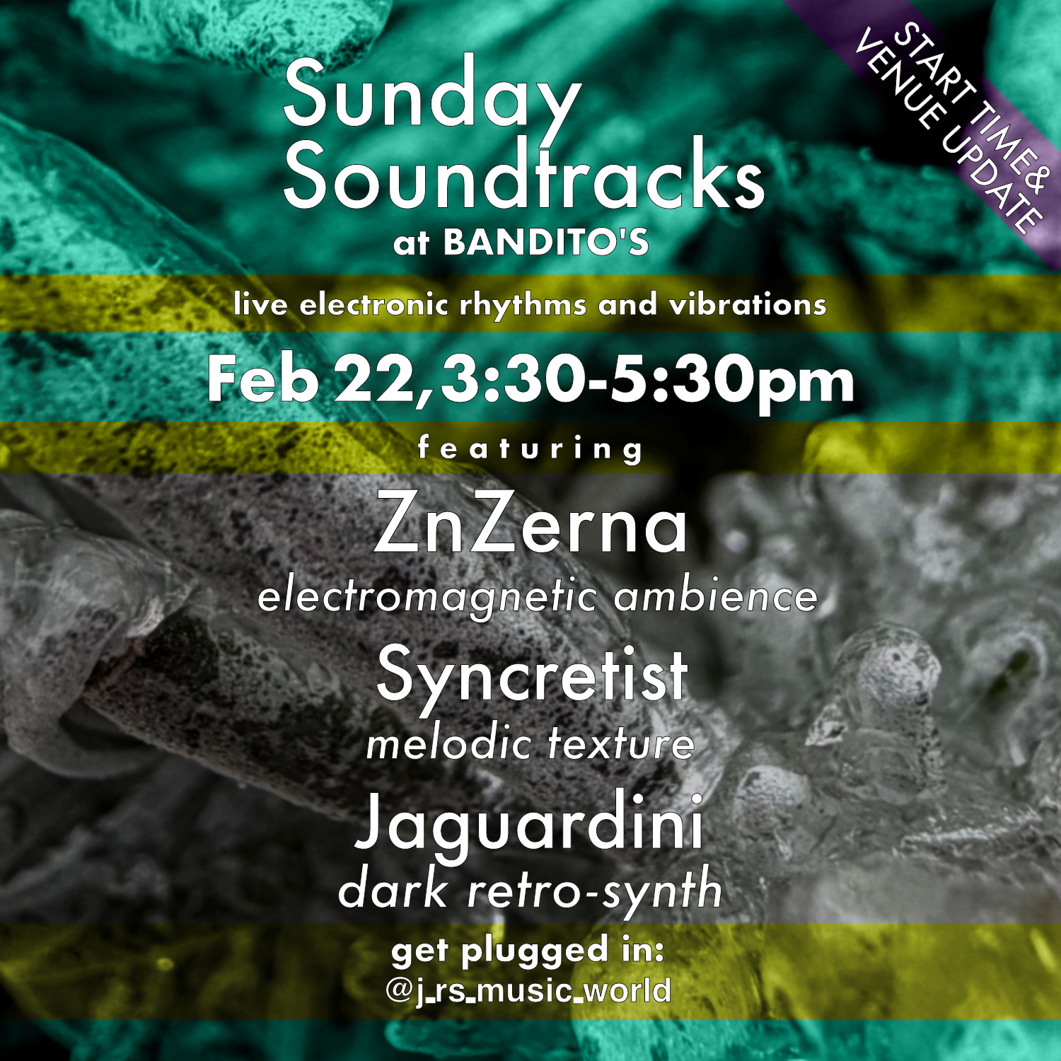 Our first time at Bandito's was on a messy, snowy Sunday, but our audience was undeterred and made it out to a really fun show. This episode featured two encore performances, including the return of ZnZerna. Colin plugged in a new version of his Esperfield synthesizer, but this time mixing it up with bombastic rhythms reminiscent of Meat Beat Manifesto. Up next was event co-host Robert Salsbury, aka Syncretist, laying down his latest set of melodic braindance. Last but not least, Jaguardini treated us to a live soundtrack to a classic zombie movie, accentuating the fake blood and gore with sequence-heavy, foreboding electronica. All that was missing was the hot-buttered popcorn.